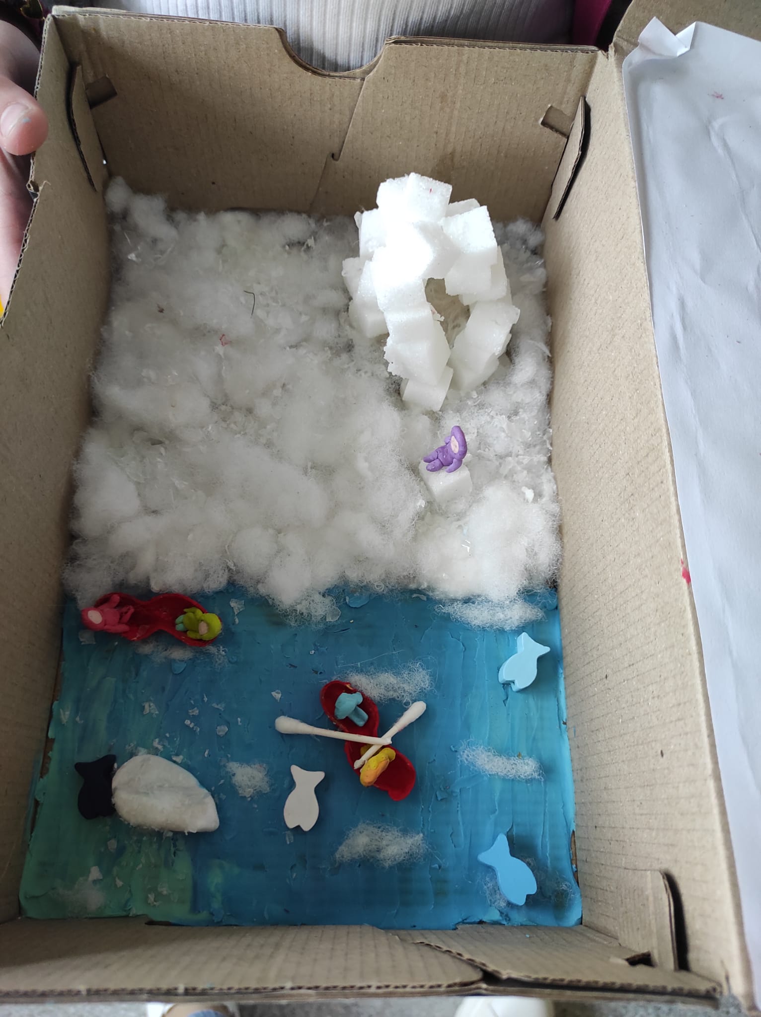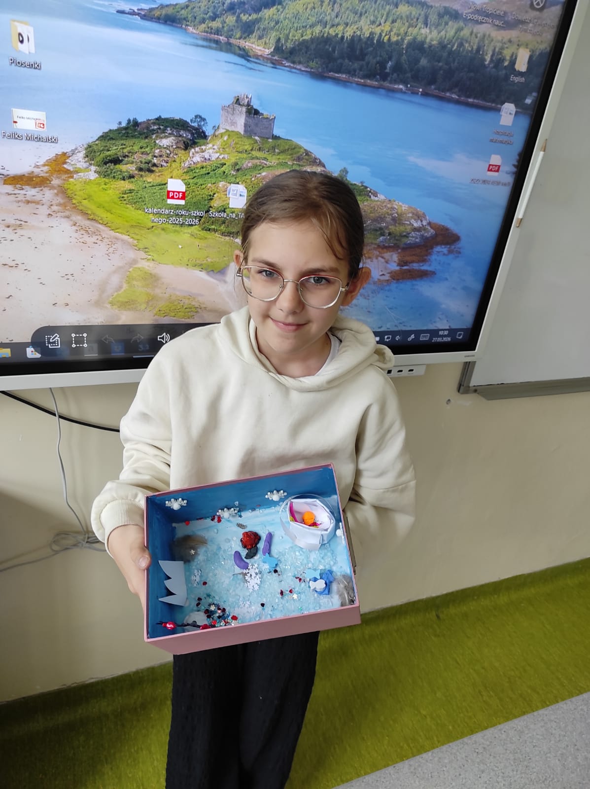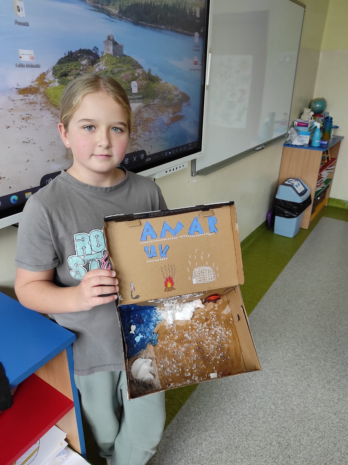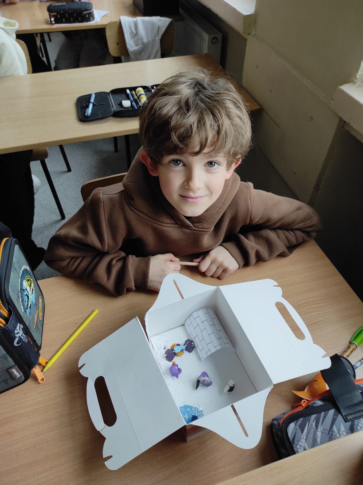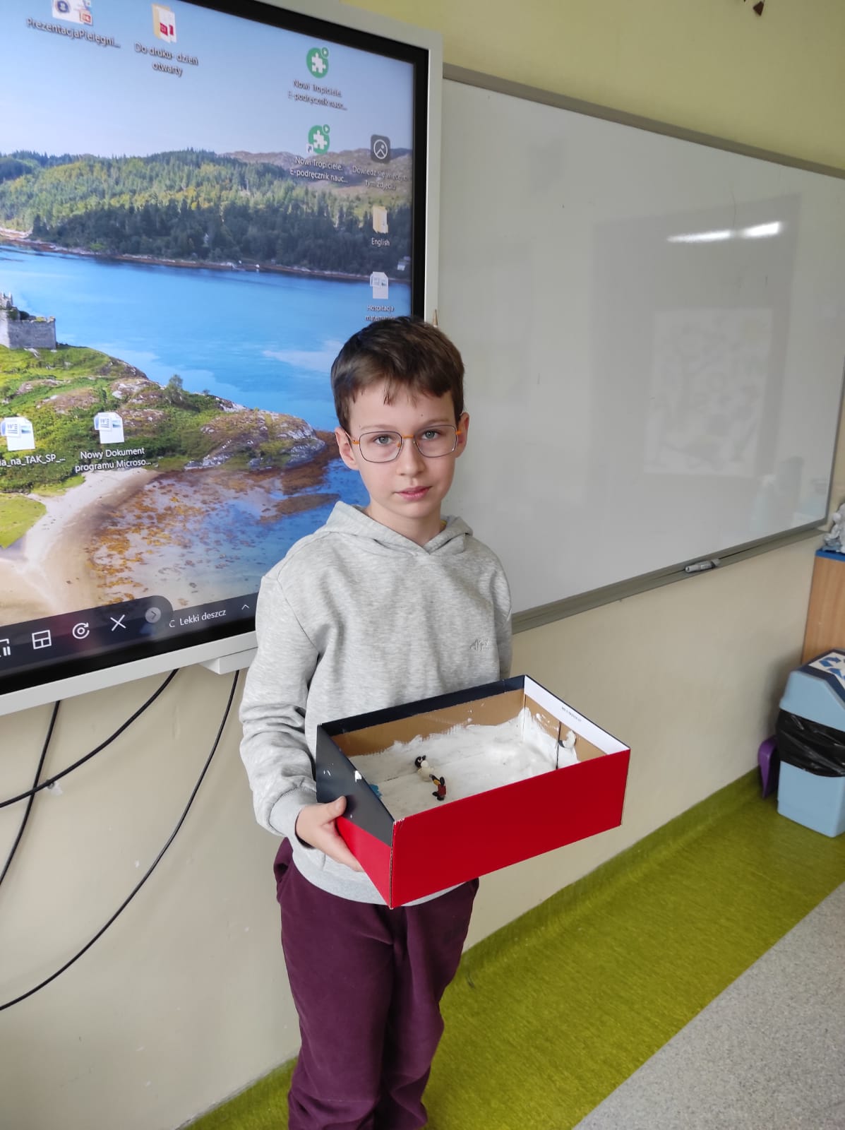 Zwieńczeniem naszej wspólnej przygody był projekt „Lektura w pudełku”. Zadanie wymagało nie tylko znajomości treści książki, ale też sporej dawki wyobraźni! W ruch poszły waty, kartony, plastelina i figurki. Efekt? W klasie wyrosły miniaturowe igloo, pojawiły się sanie ciągnięte przez psy i mroźne krajobrazy Arktyki.
