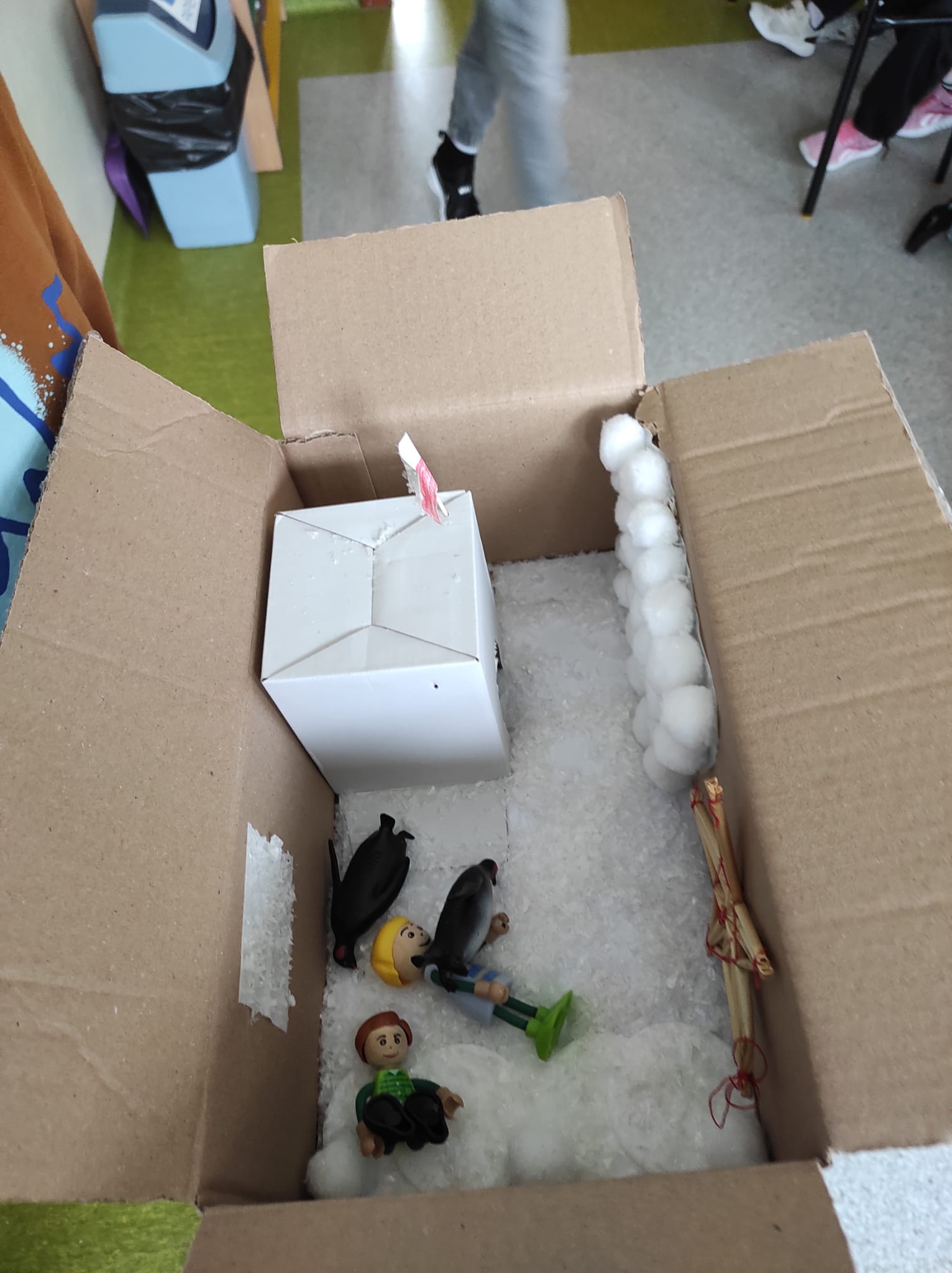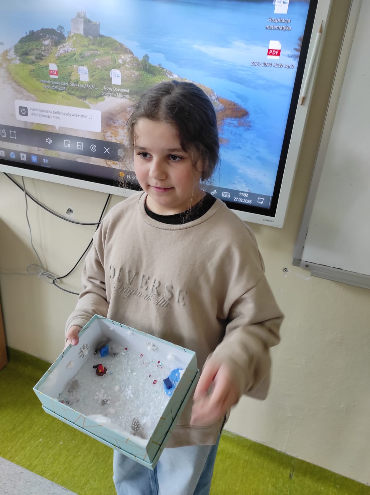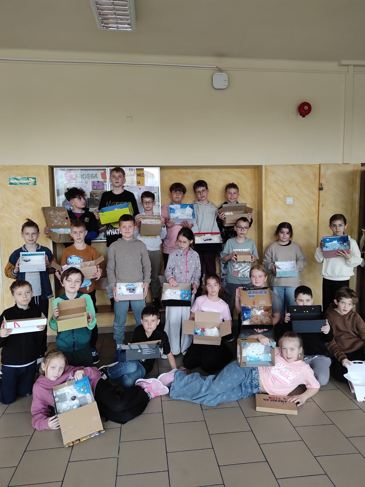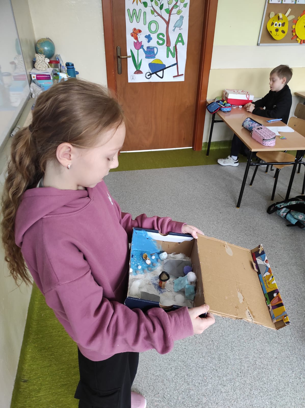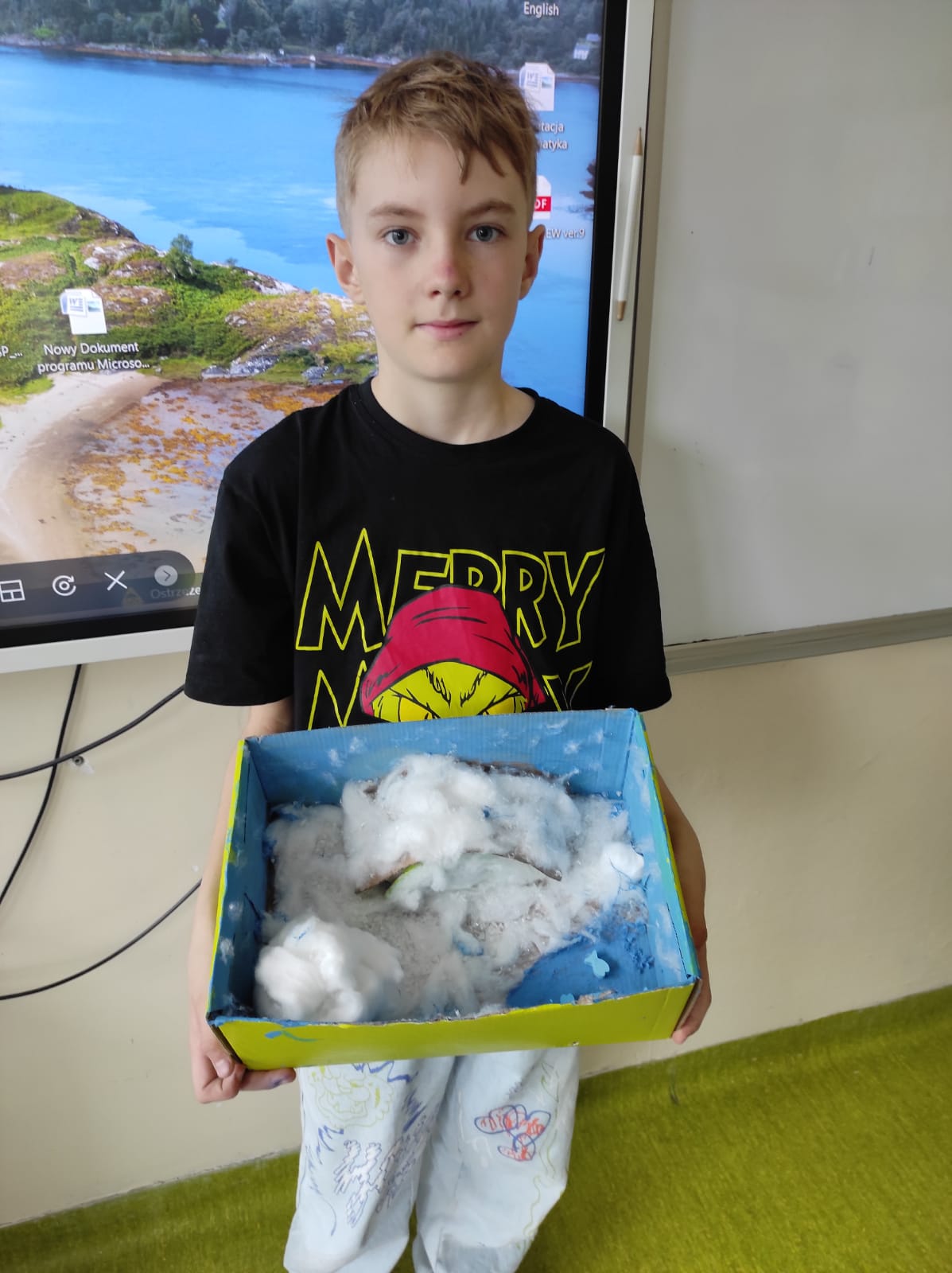Zwieńczeniem naszej wspólnej przygody był projekt „Lektura w pudełku”. Zadanie wymagało nie tylko znajomości treści książki, ale też sporej dawki wyobraźni! W ruch poszły waty, kartony, plastelina i figurki. Efekt? W klasie wyrosły miniaturowe igloo, pojawiły się sanie ciągnięte przez psy i mroźne krajobrazy Arktyki.