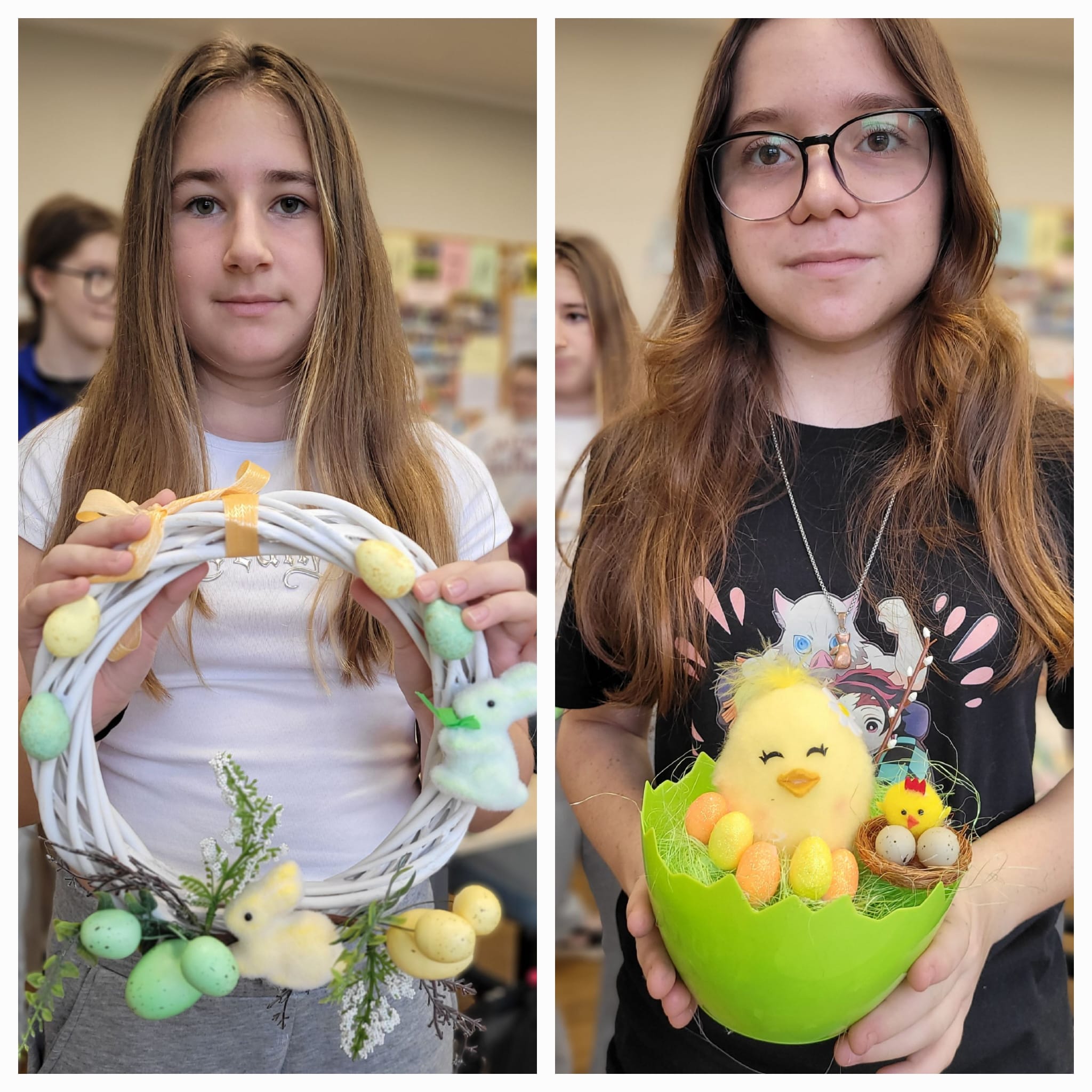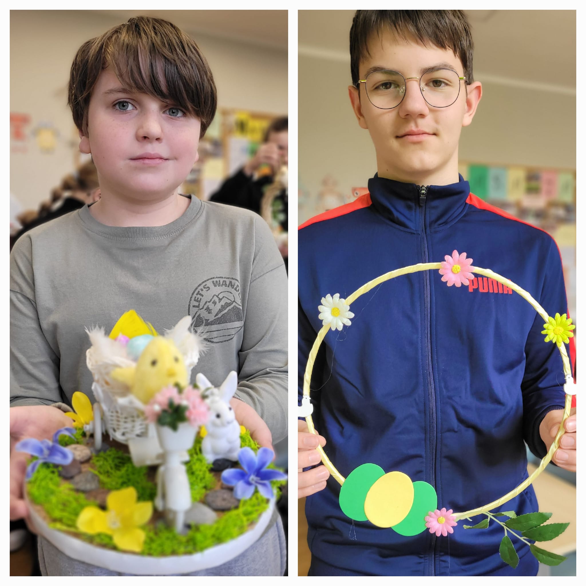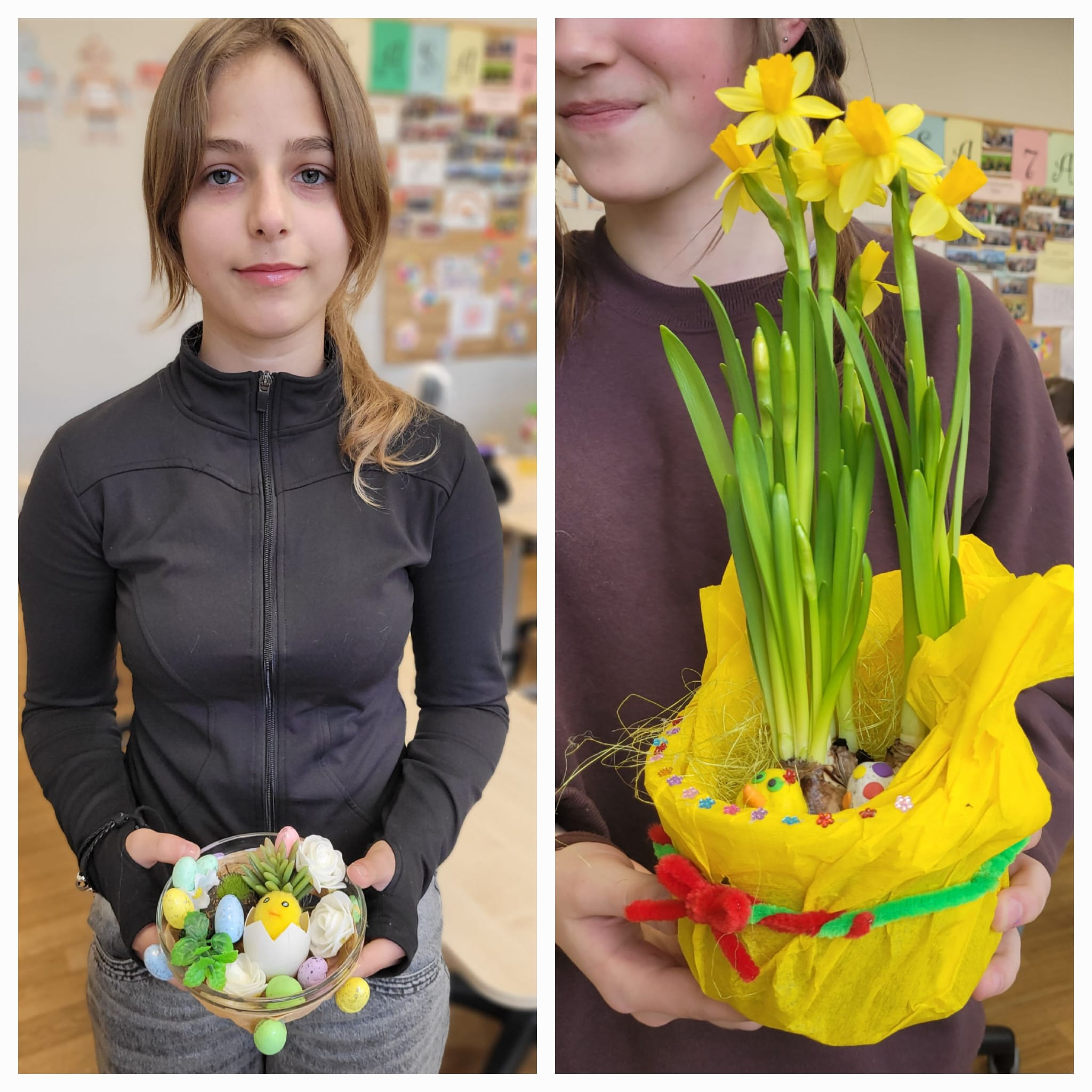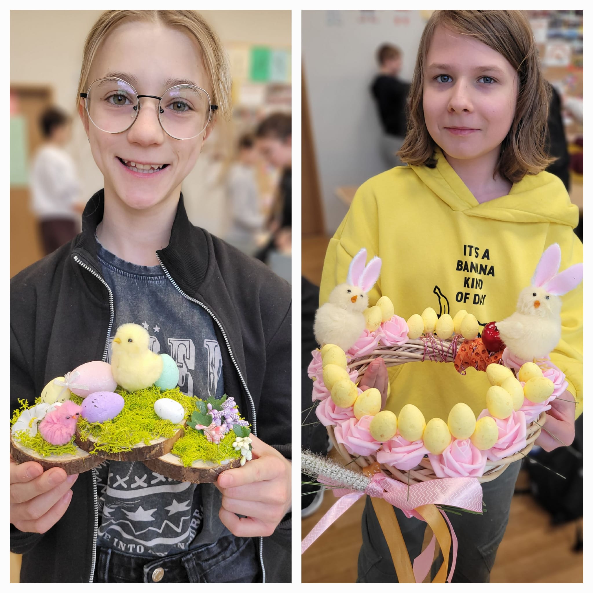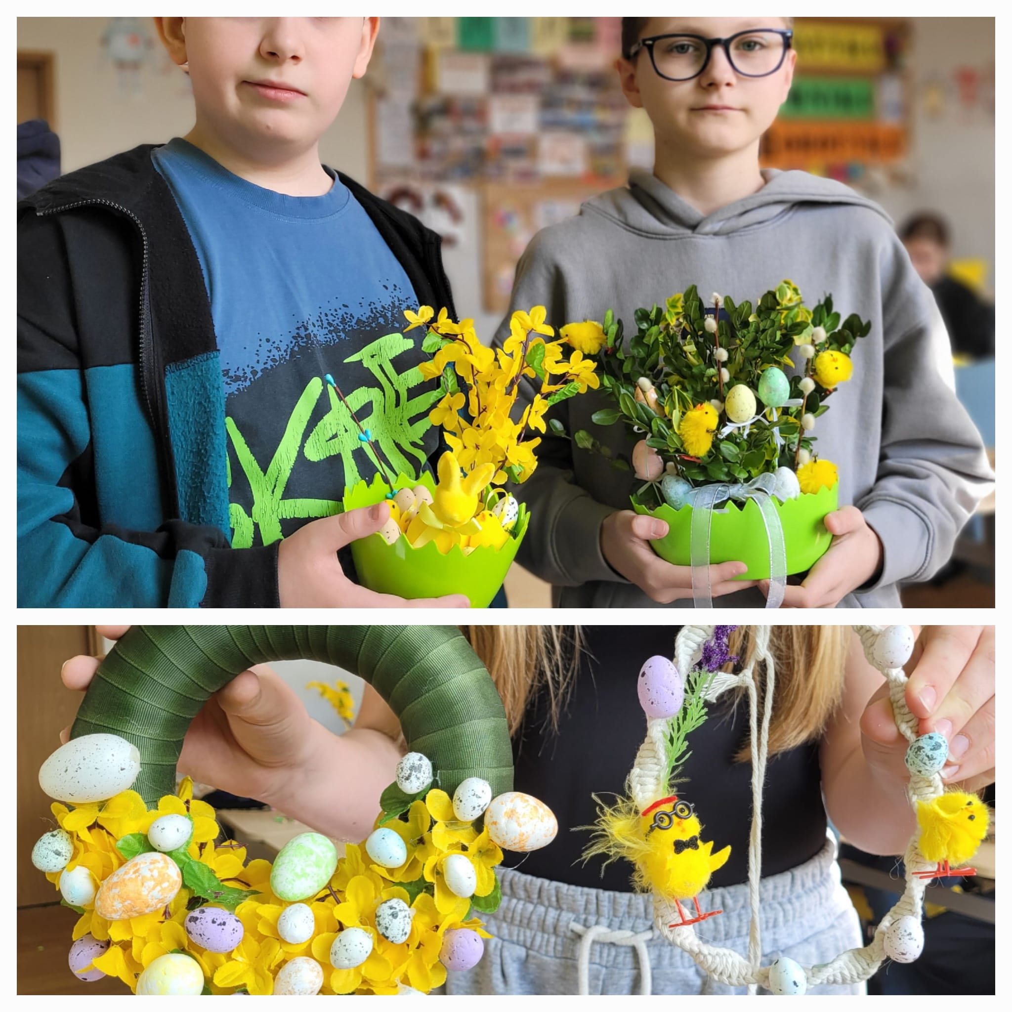 Na ostatnich zajęciach uczniowie klas 6 mieli okazję wykazać się kreatywnością i zdolnościami manualnymi. Ich zadaniem było wykonanie wiosennej ozdoby według własnego pomysłu.