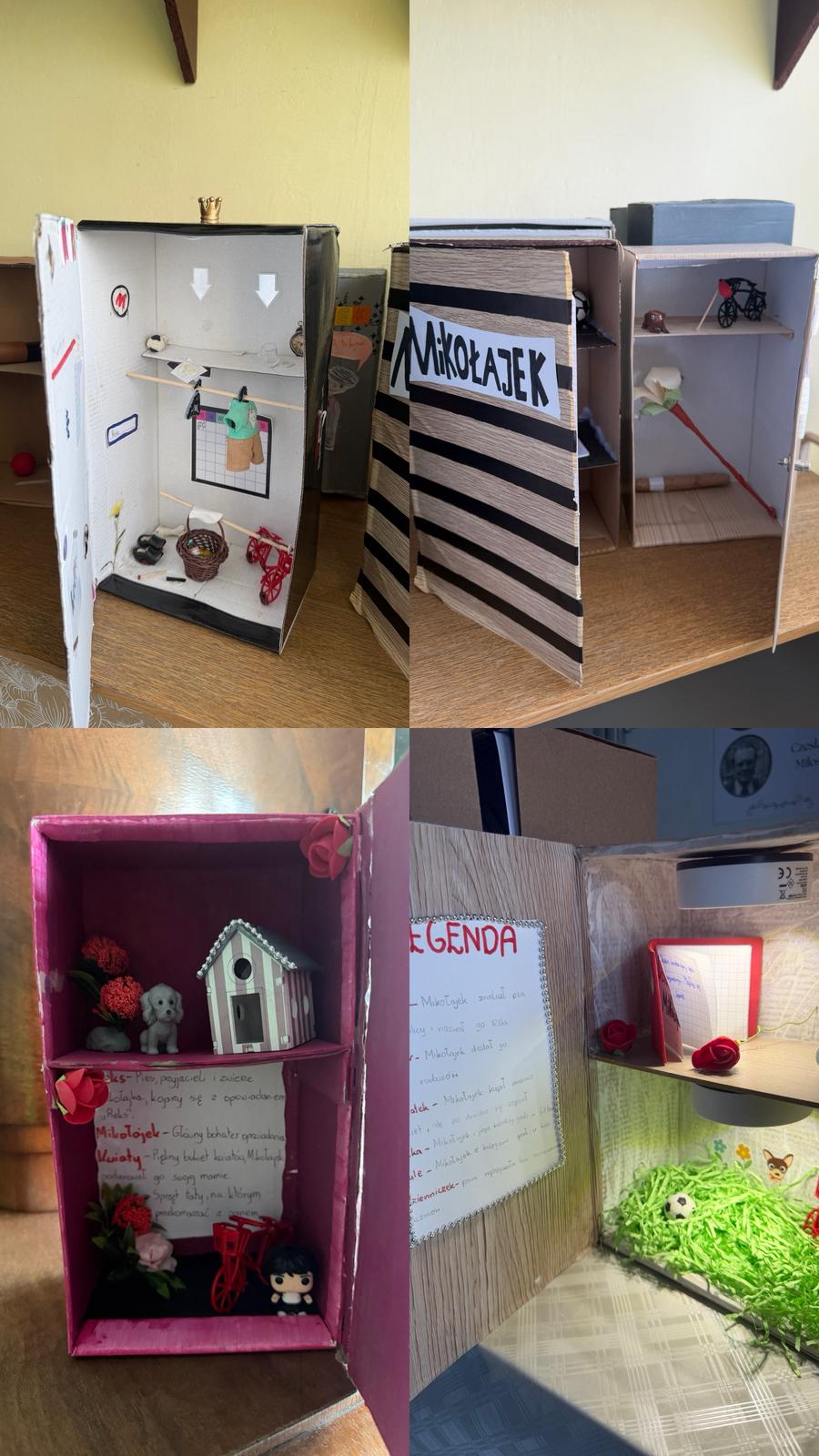 Ich zadaniem było przygotowanie „szafki bohatera” – w każdej znalazło się 5 przedmiotów związanych z przygodami Mikołajka. Do każdego elementu uczniowie dopisali krótkie wyjaśnienia, pokazując, jak dobrze znają książkę i jej bohaterów.