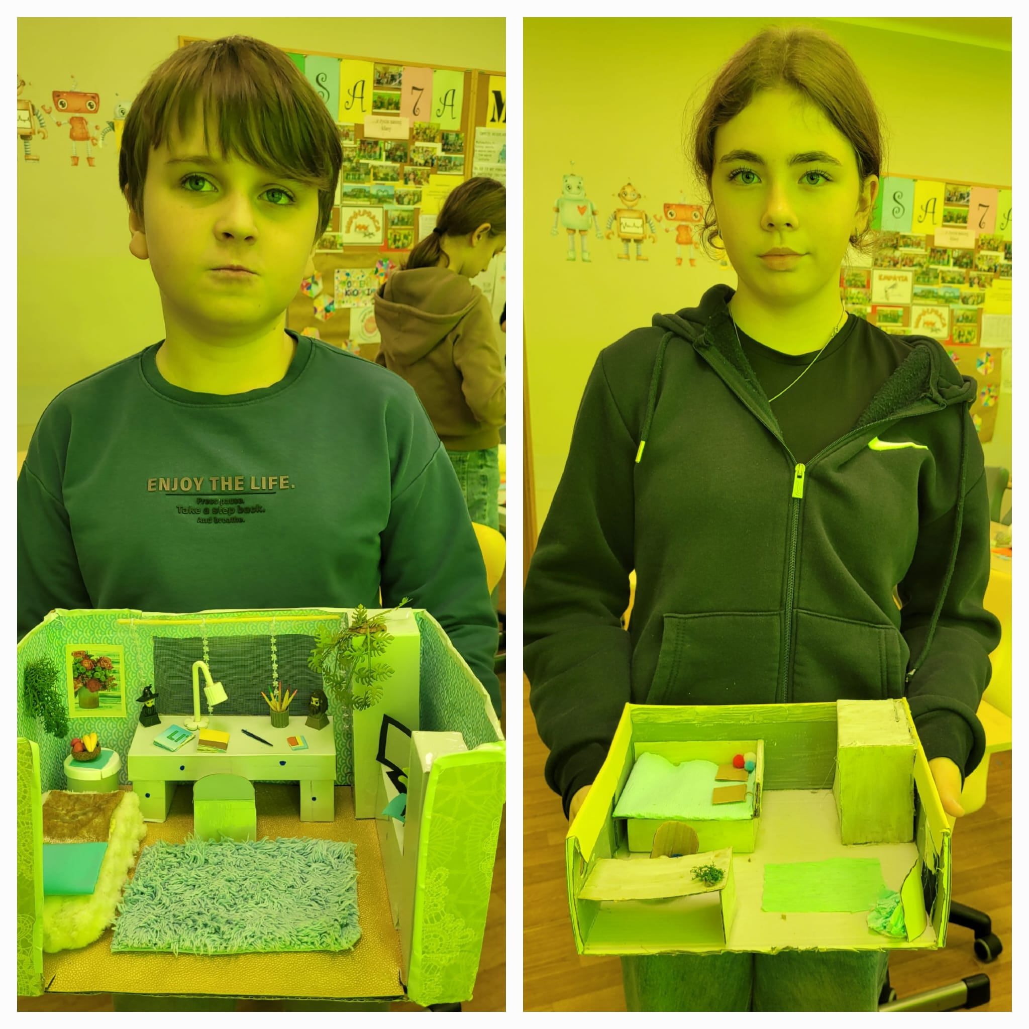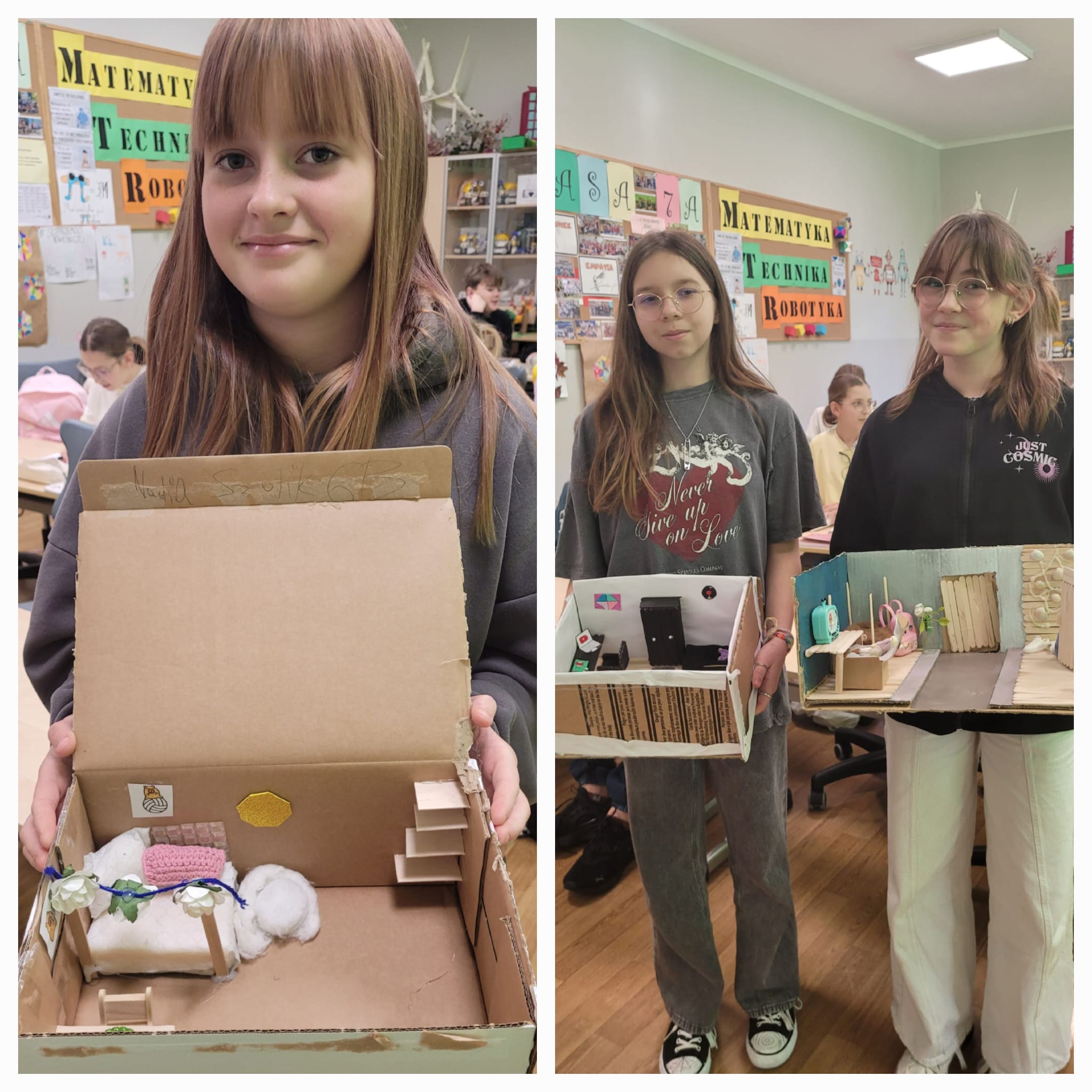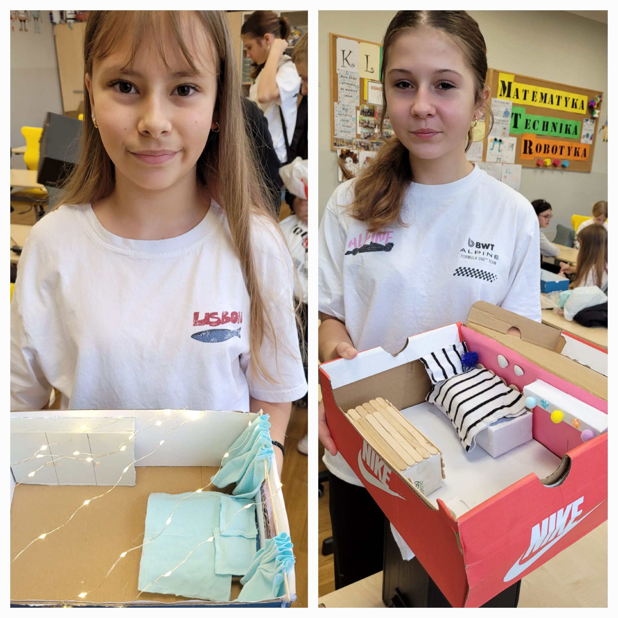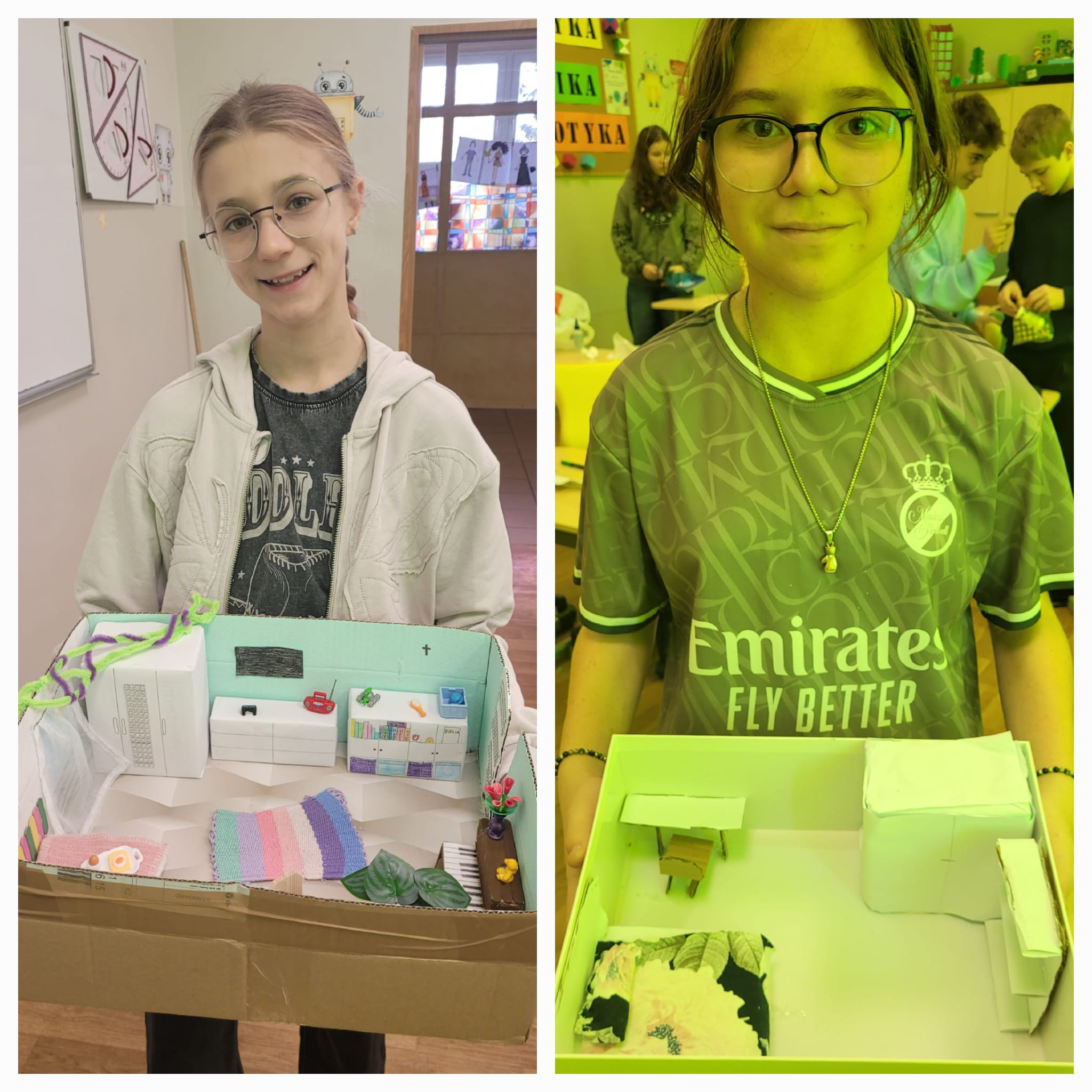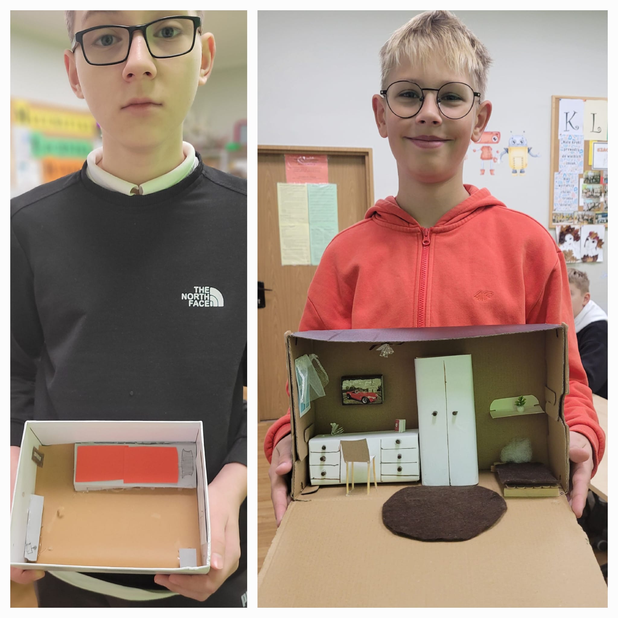 Uczniowie klas szóstych zakończyli właśnie prace nad kolejnym projektem technicznym. Tym razem każdy z nich indywidualnie zaprojektował i wykonał makietę wymarzonego pokoju nastolatka — takiego, jaki chcieliby mieć lub jaki wyobrażają sobie jako idealny. Pomysły okazały się niezwykle różnorodne: od pokoi pełnych kolorów i nowoczesnych mebli, przez przestrzenie sportowe, muzyczne czy gamingowe, aż po minimalistyczne, spokojne wnętrza. W makietach pojawiły się łóżka, biurka, regały, oświetlenie, a nawet najdrobniejsze dodatki wykonane z kartonu, papieru czy materiałów recyklingowych. Praca nad projektem wymagała wyobraźni, dokładności, cierpliwości i planowania — a uczniowie poradzili sobie z tym doskonale! To był naprawdę kreatywny i inspirujący czas spędzony w sali 109 na lekcjach techniki. Efekty ich pracy prezentują się imponująco — można je podziwiać w holu na parterze szkoły, tuż obok wyjścia na rekreację.