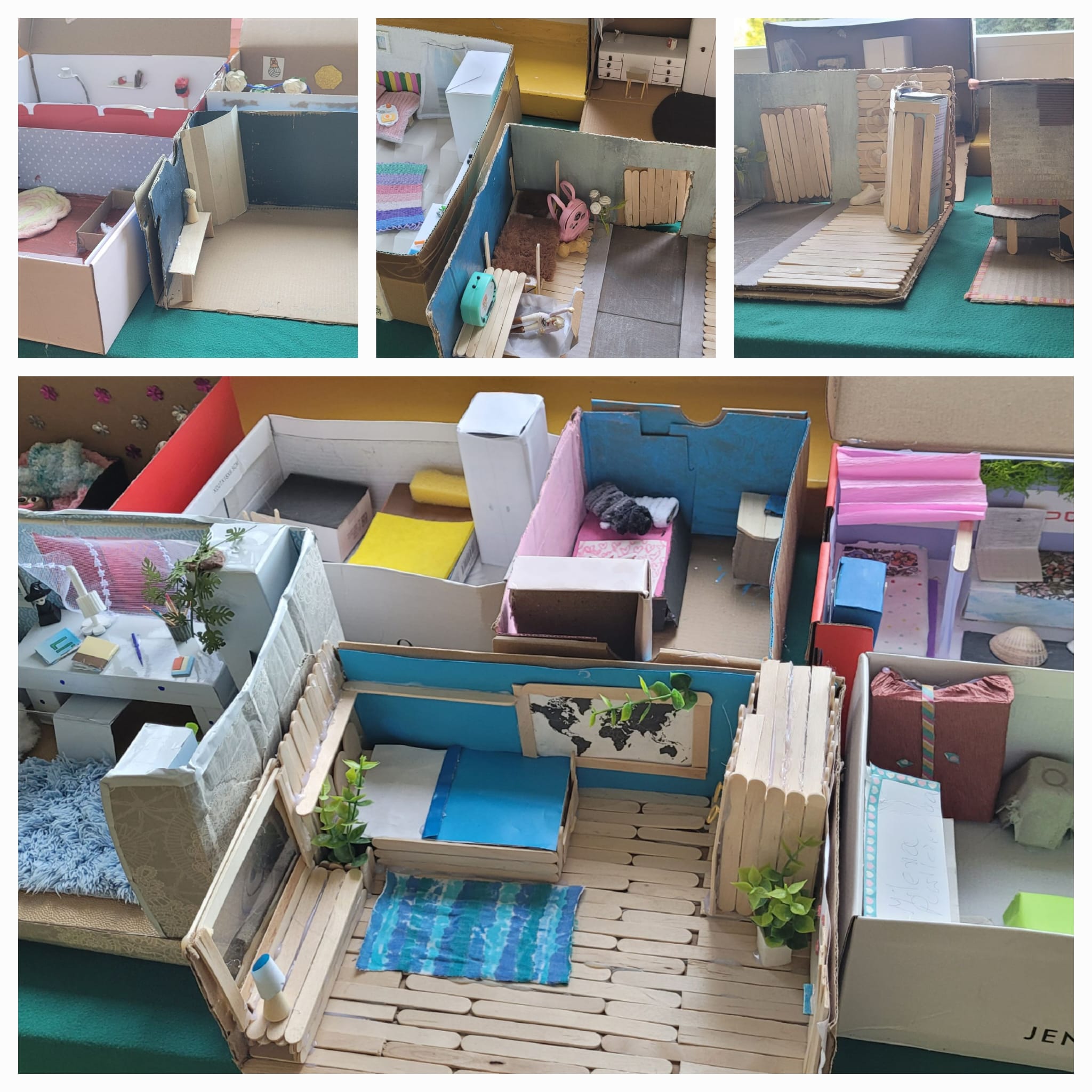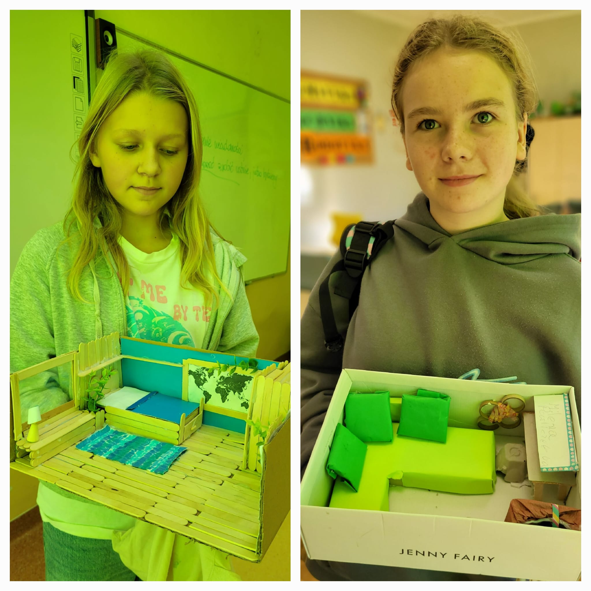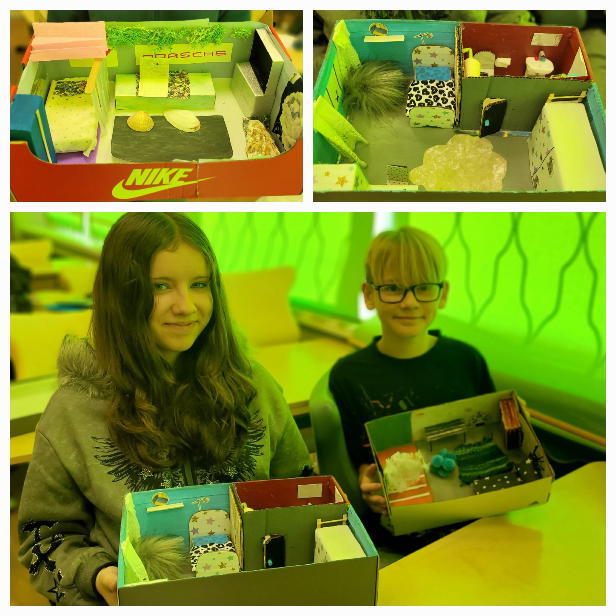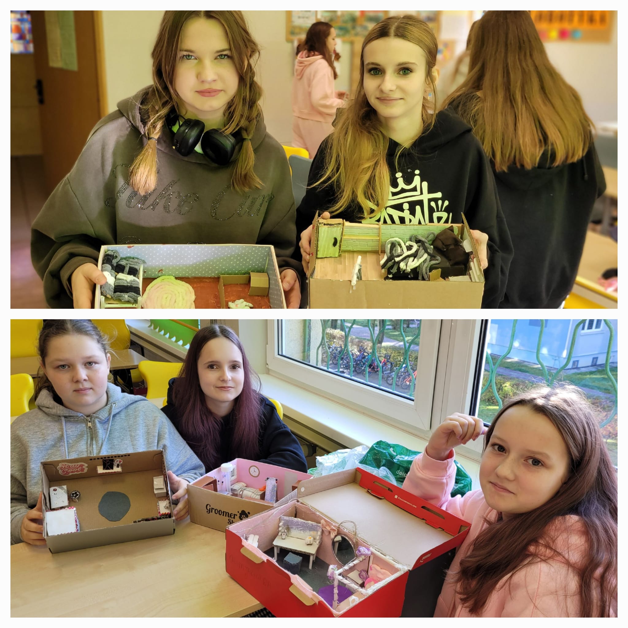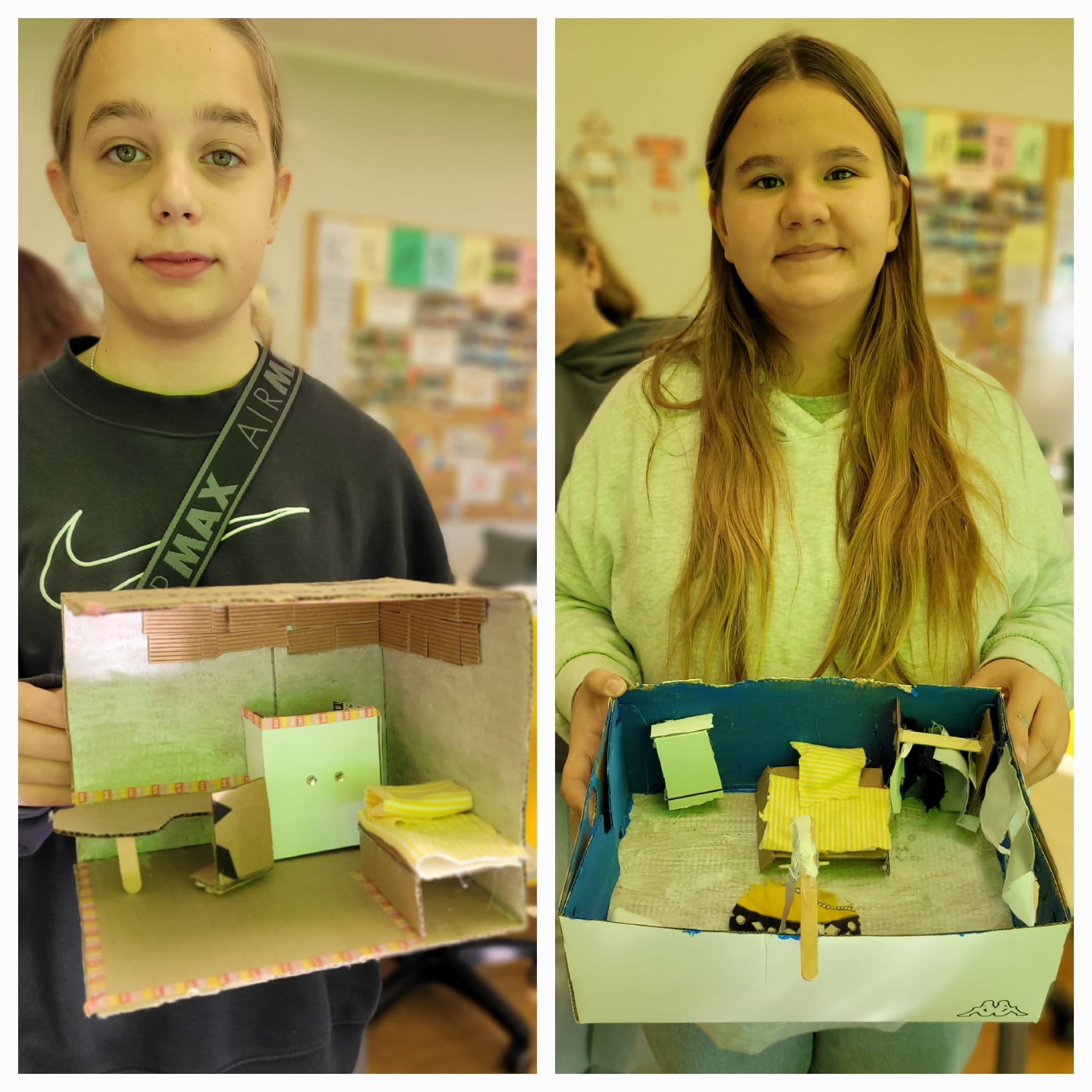 Uczniowie klas szóstych zakończyli właśnie prace nad kolejnym projektem technicznym. Tym razem każdy z nich indywidualnie zaprojektował i wykonał makietę wymarzonego pokoju nastolatka — takiego, jaki chcieliby mieć lub jaki wyobrażają sobie jako idealny. Pomysły okazały się niezwykle różnorodne: od pokoi pełnych kolorów i nowoczesnych mebli, przez przestrzenie sportowe, muzyczne czy gamingowe, aż po minimalistyczne, spokojne wnętrza. W makietach pojawiły się łóżka, biurka, regały, oświetlenie, a nawet najdrobniejsze dodatki wykonane z kartonu, papieru czy materiałów recyklingowych. Praca nad projektem wymagała wyobraźni, dokładności, cierpliwości i planowania — a uczniowie poradzili sobie z tym doskonale! To był naprawdę kreatywny i inspirujący czas spędzony w sali 109 na lekcjach techniki. Efekty ich pracy prezentują się imponująco — można je podziwiać w holu na parterze szkoły, tuż obok wyjścia na rekreację.