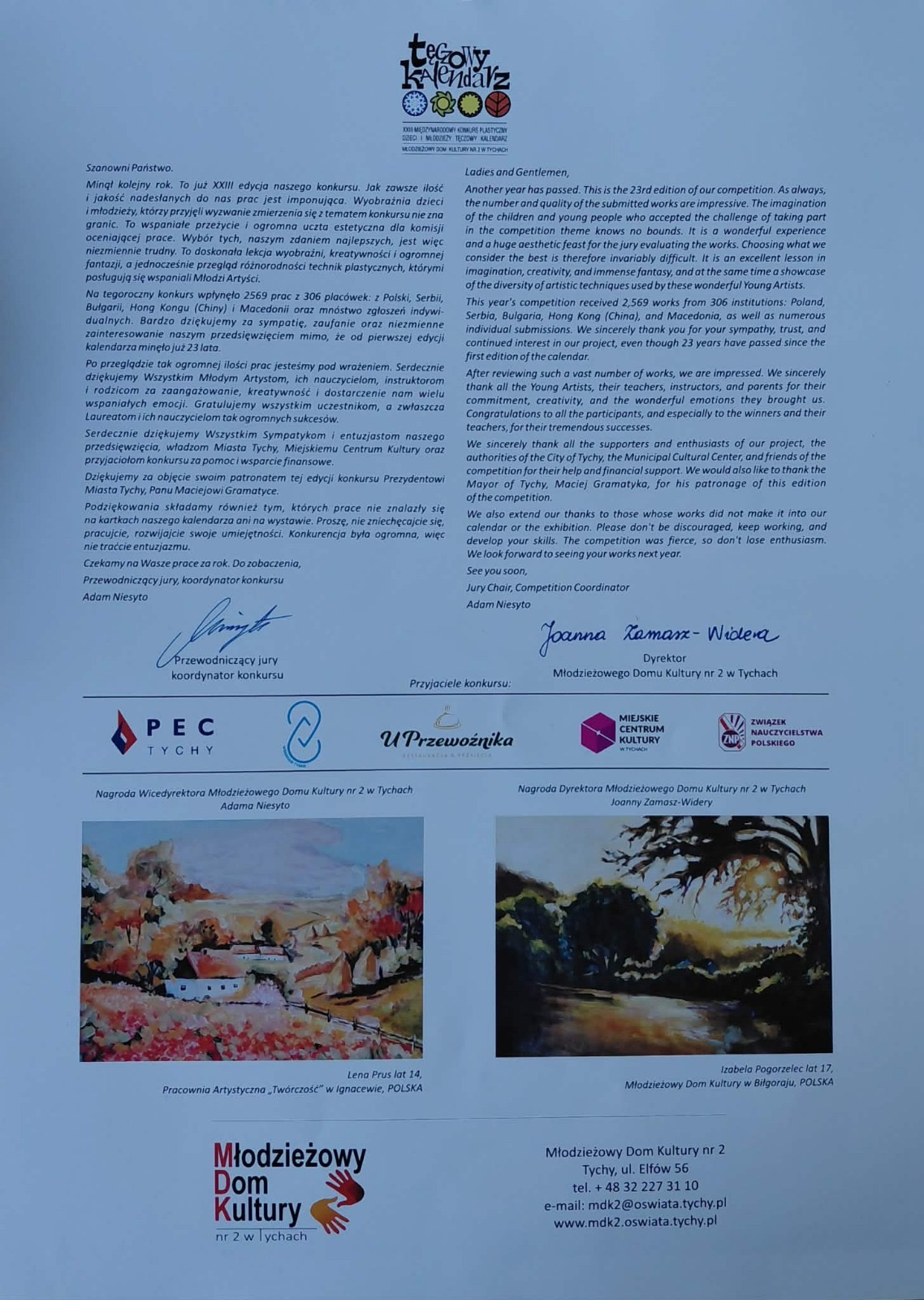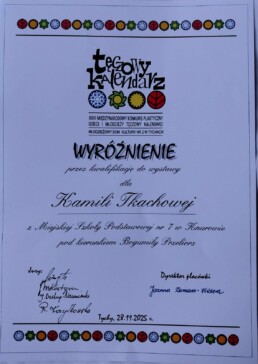 Z radością informujemy, iż uczennica naszej szkoły Kamila Tkachova z kl. 6a otrzymała wyróżnienie oraz kwalifikację do wystawy w XXII Międzynarodowym Konkursie Plastycznym „Tęczowy kalendarz”. Kamila w oryginalny sposób zinterpretowała jedną z pór roku. Na konkurs plastyczny wpłynęło 2569 prac z 306 placówek z Polski, Serbii, Bułgarii, Hongkongu i Macedonii. Wyróżnione prace zostały zwizualizowane w postaci pięknego kalendarza na 2026 rok.