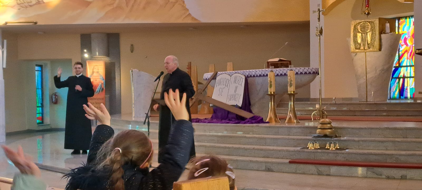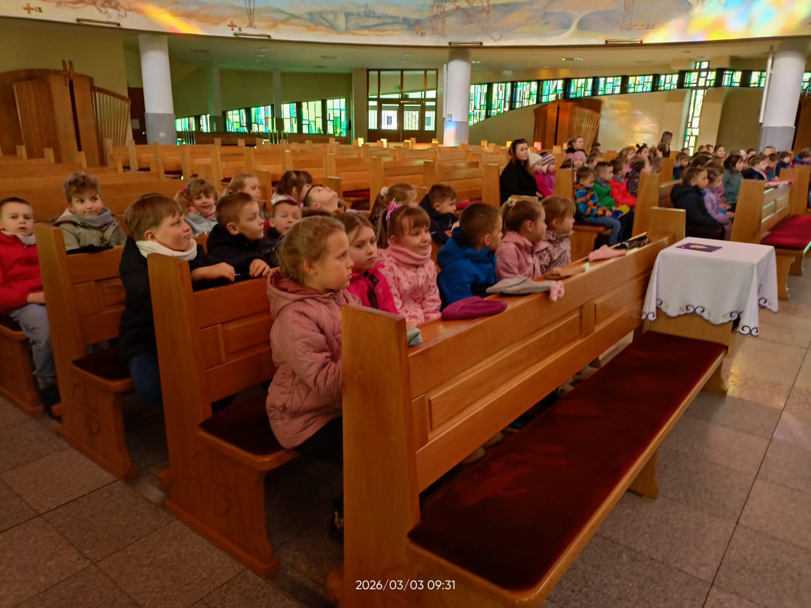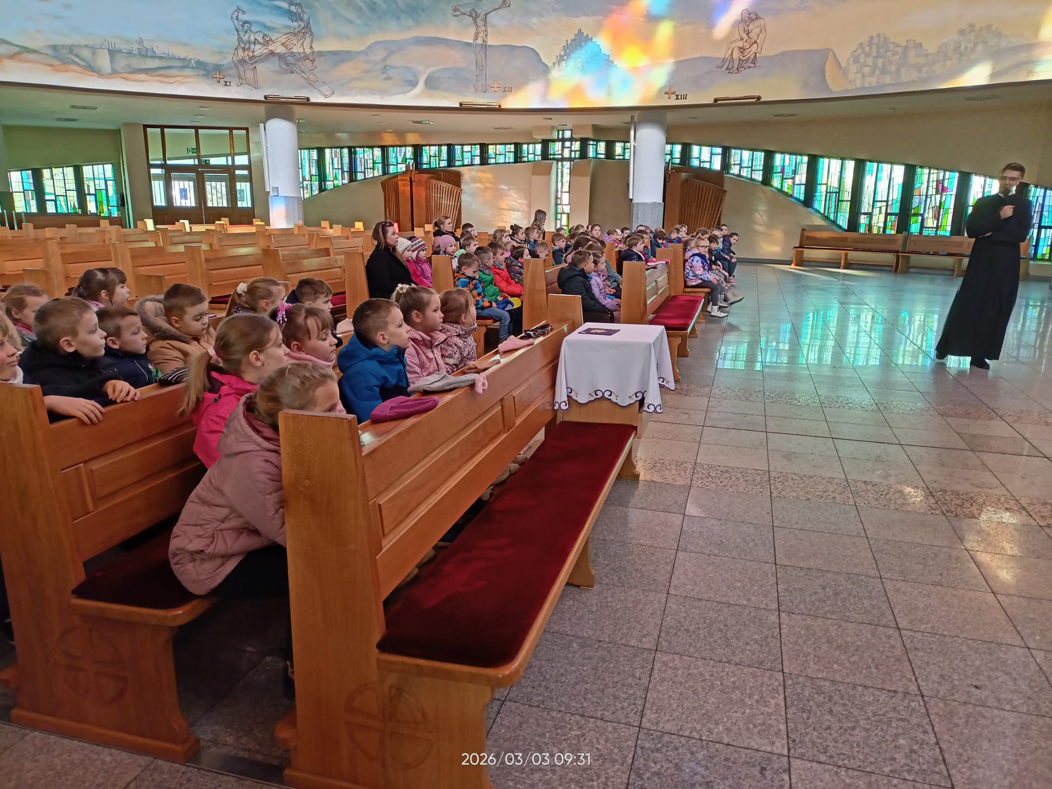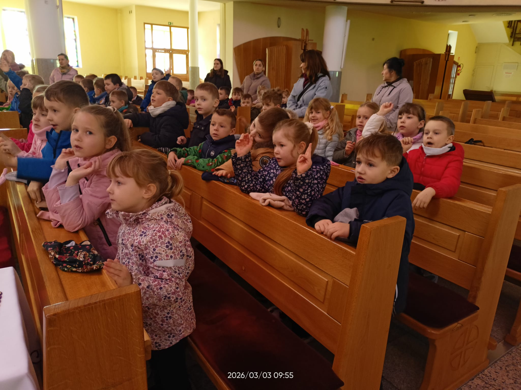 Dziś dzieci z oddziału zerowego uczestniczyły w rekolekcjach wielkopostnych w naszej parafii, podczas których w prosty i radosny sposób poznawały, czym jest modlitwa oraz jak rozmawiać z Panem Jezusem. Poprzez opowieści, wspólną modlitwę i zabawy maluchy uczyły się, dlaczego warto chodzić do kościoła i być blisko Pana Jezusa. Był to piękny czas refleksji oraz radości z bycia razem przy Panu Bogu.