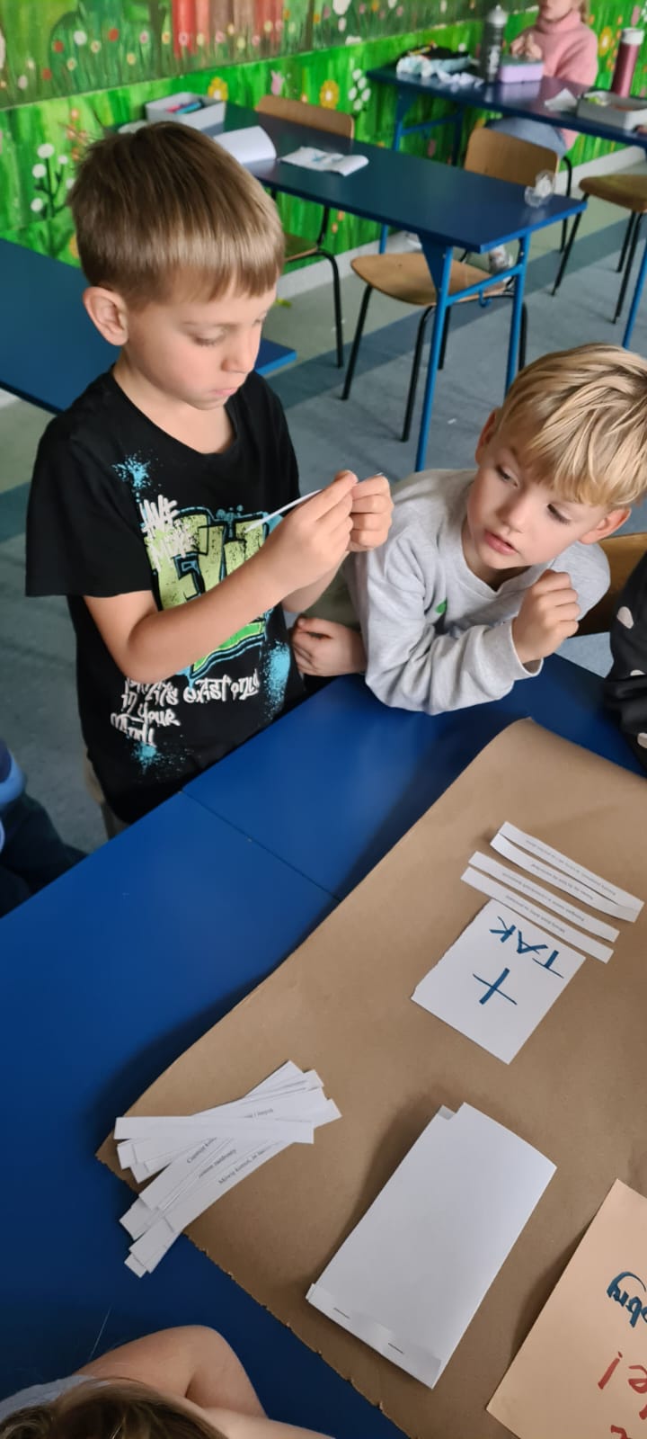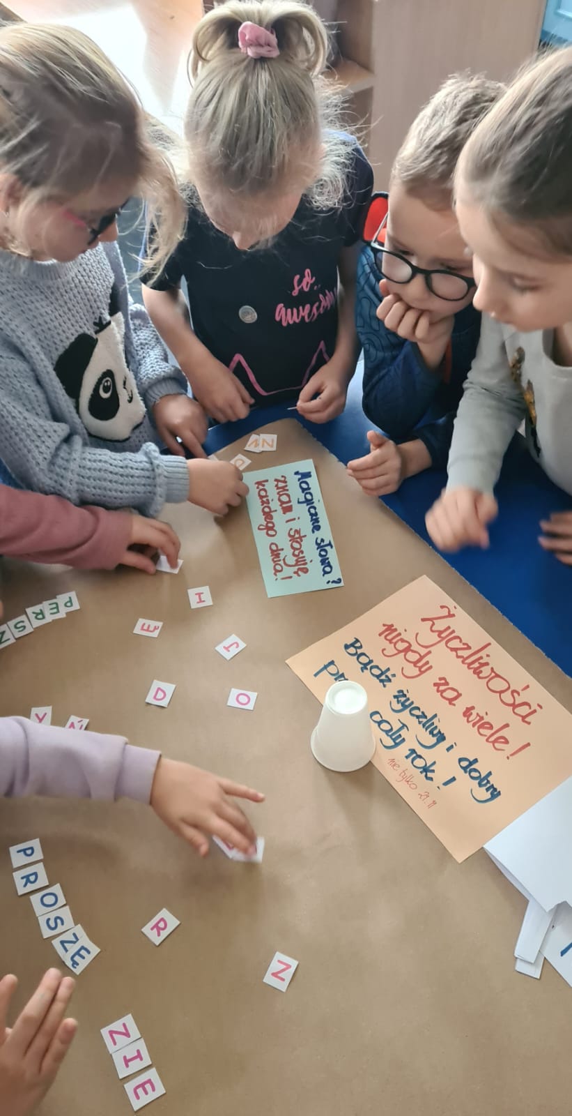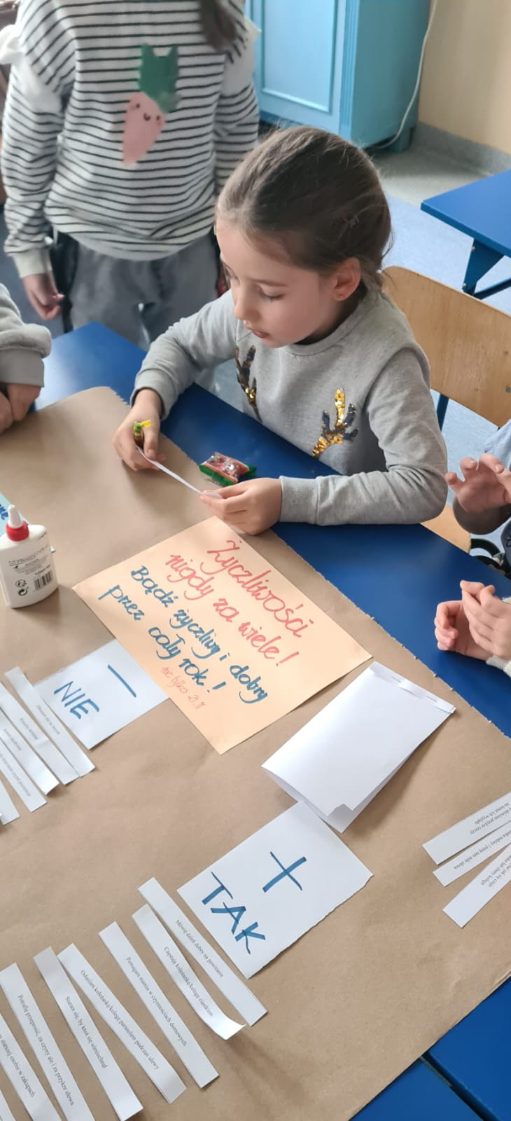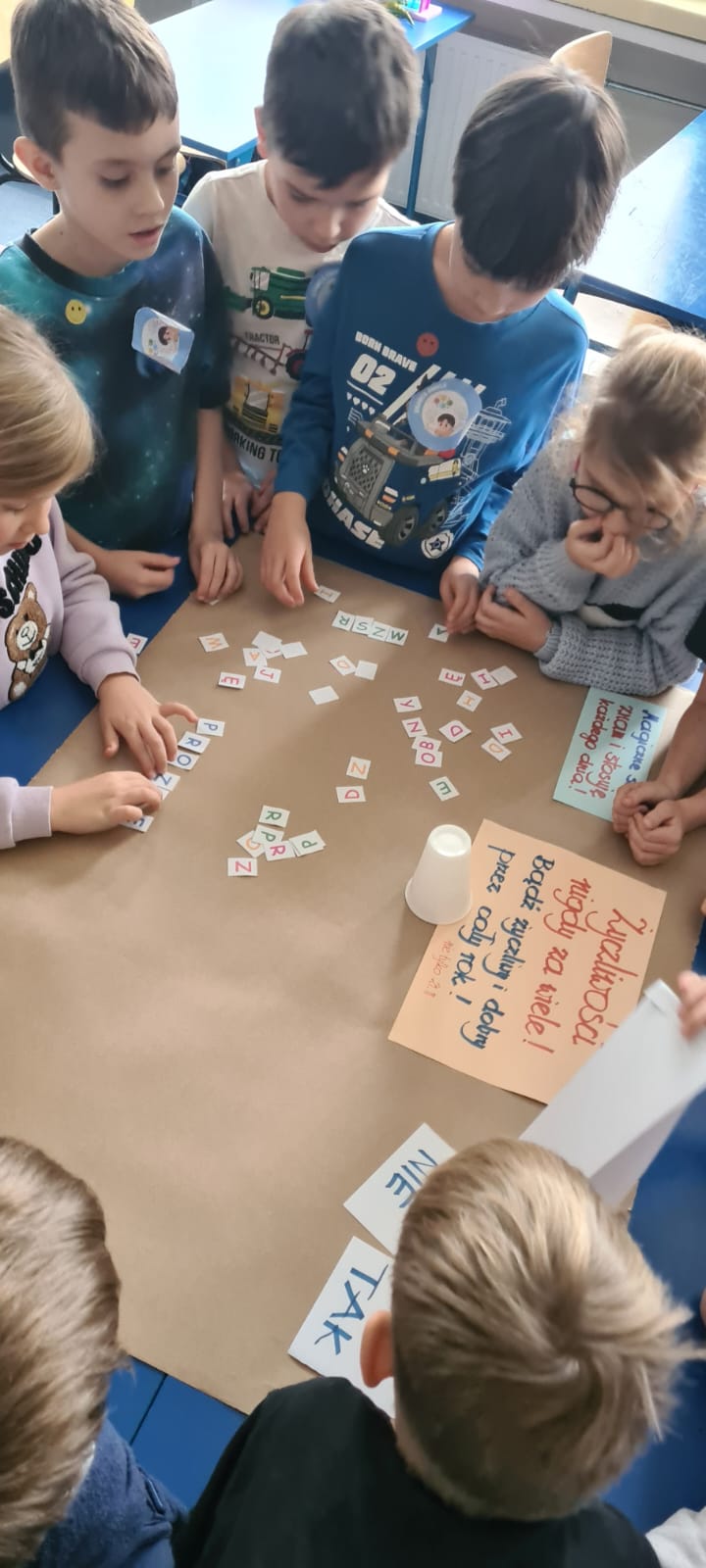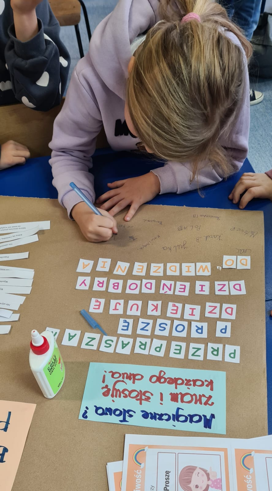 Uczniowie porządkowali karteczki z opisami zachowań i postaw dobrze znanych ludziom życzliwym oraz takich, których nie należy naśladować. Omówiliśmy sytuacje, w których należy pamiętać o magicznych słowach. Następnie powstał plakat do omówionego tematu.