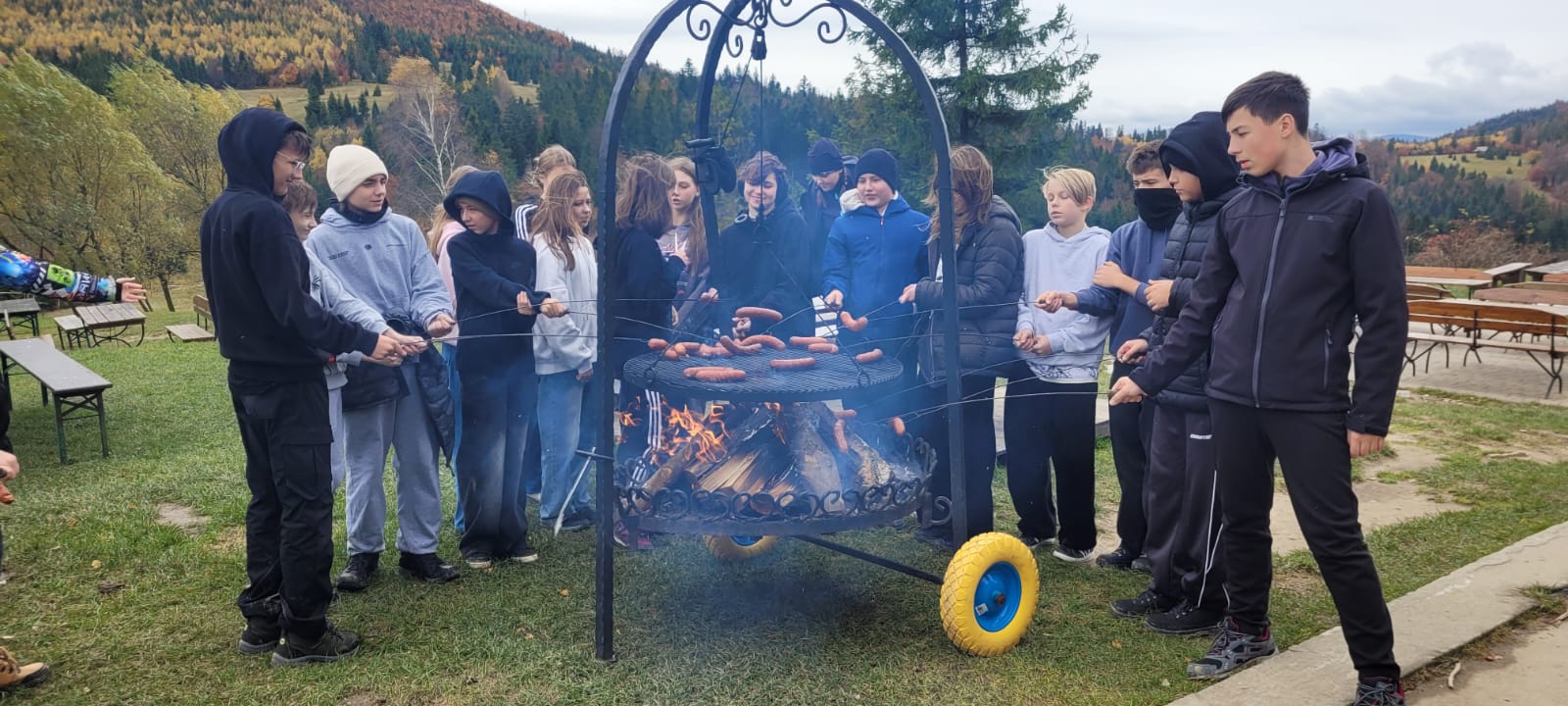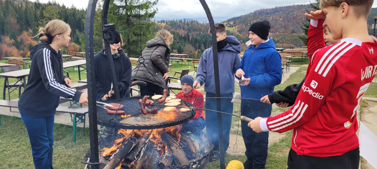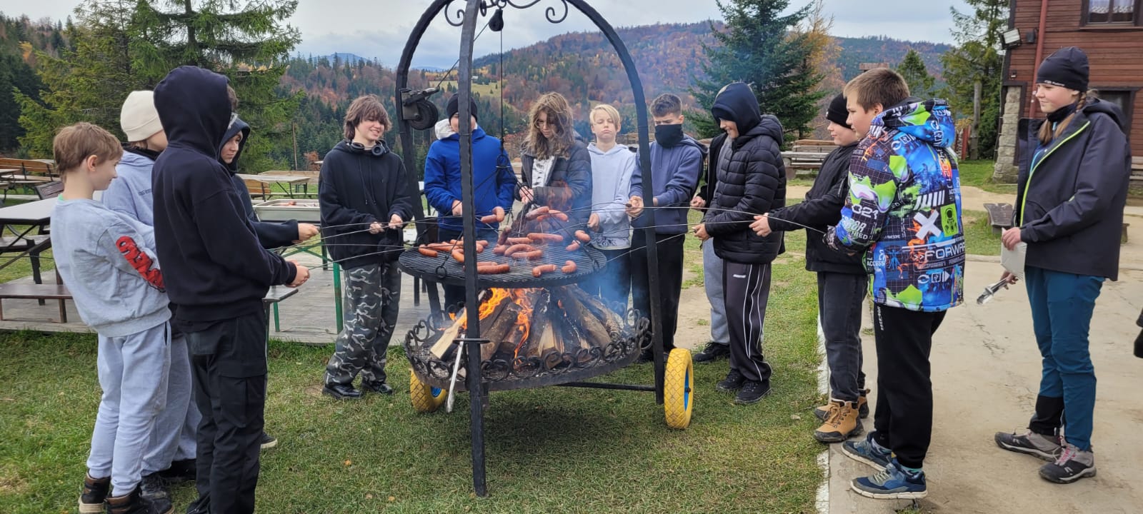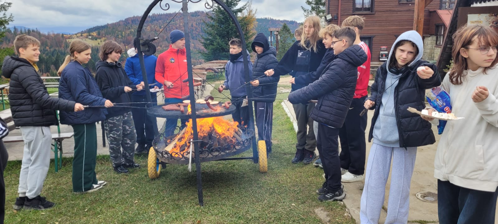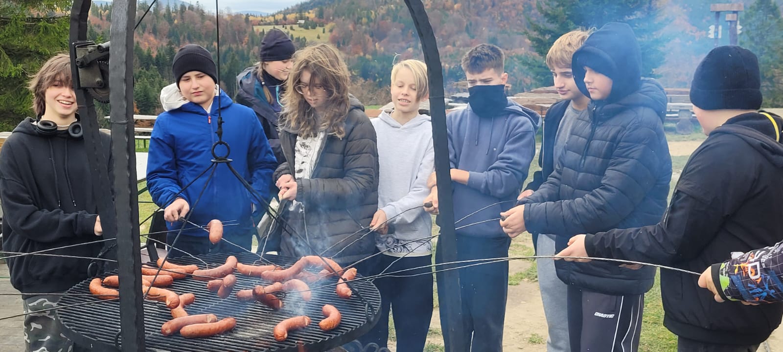Po lekcji historii przyszła pora na kontakt z naturą – wędrówka szlakiem z Żabnicy na Halę Boraczą, gdzie czekało na wszystkich ognisko z pysznym pieczeniem kiełbasek. W drodze powrotnej uczniowie podziwiali malownicze widoki, schodząc niebieskim szlakiem przez Prusów.