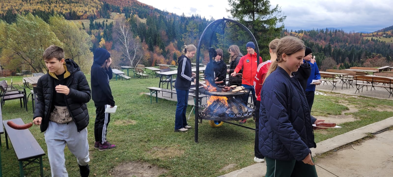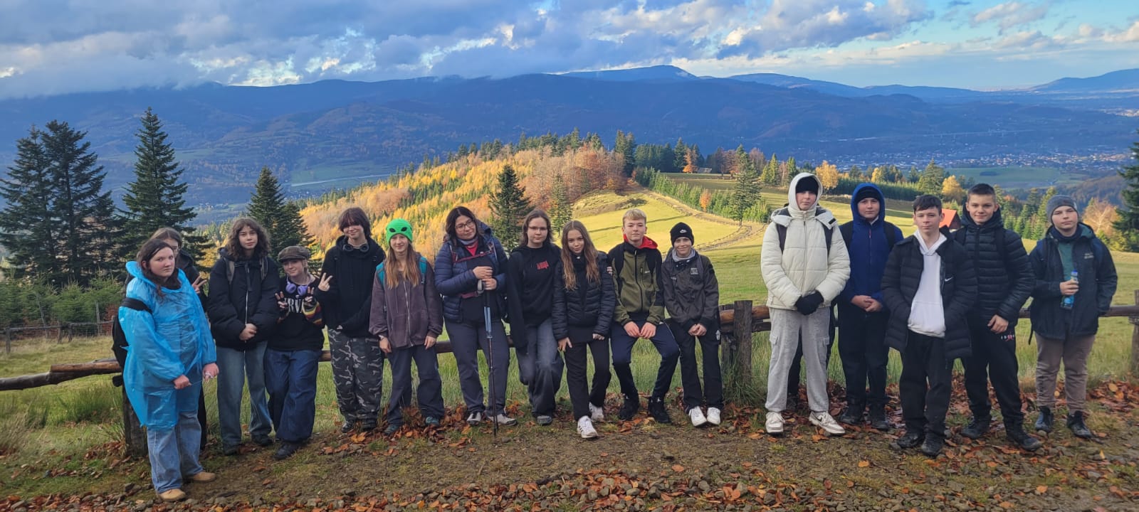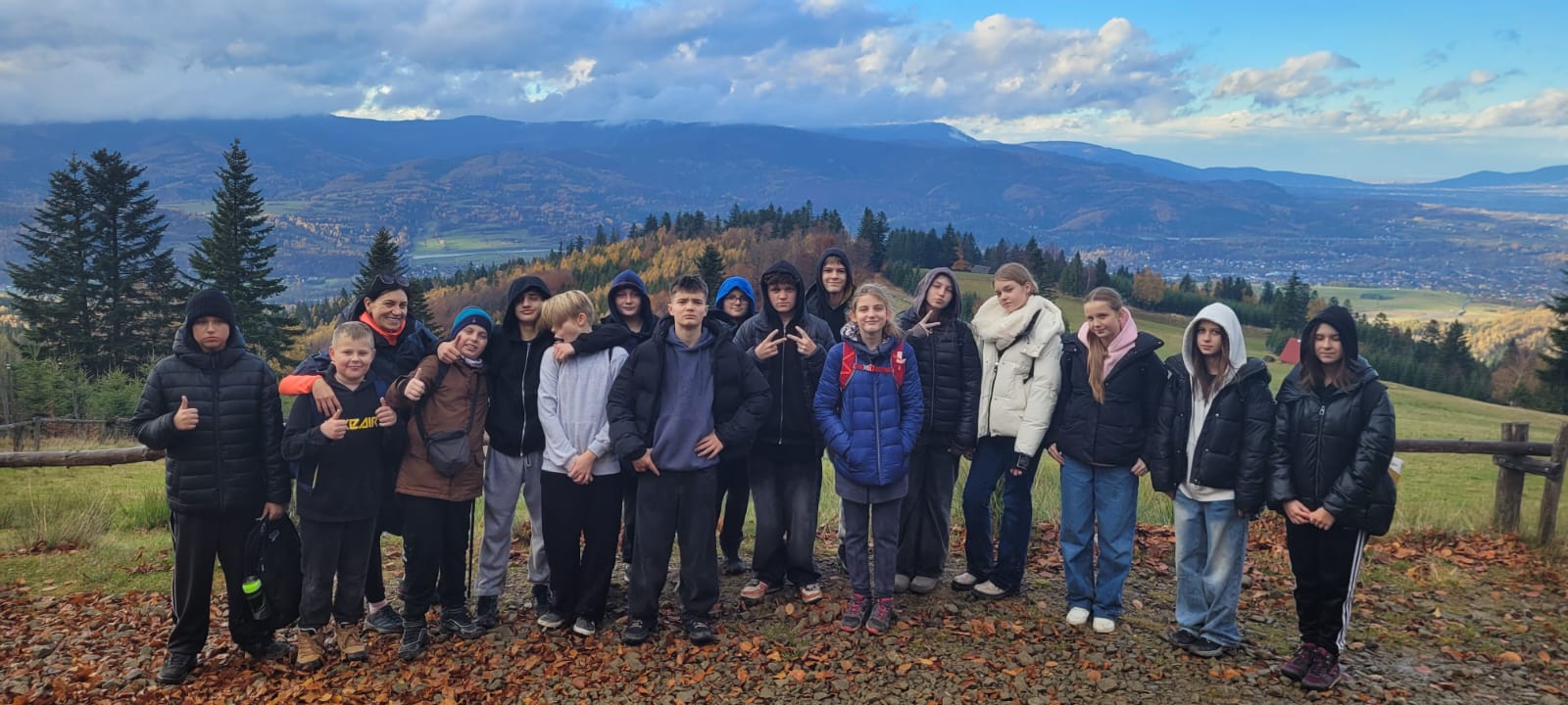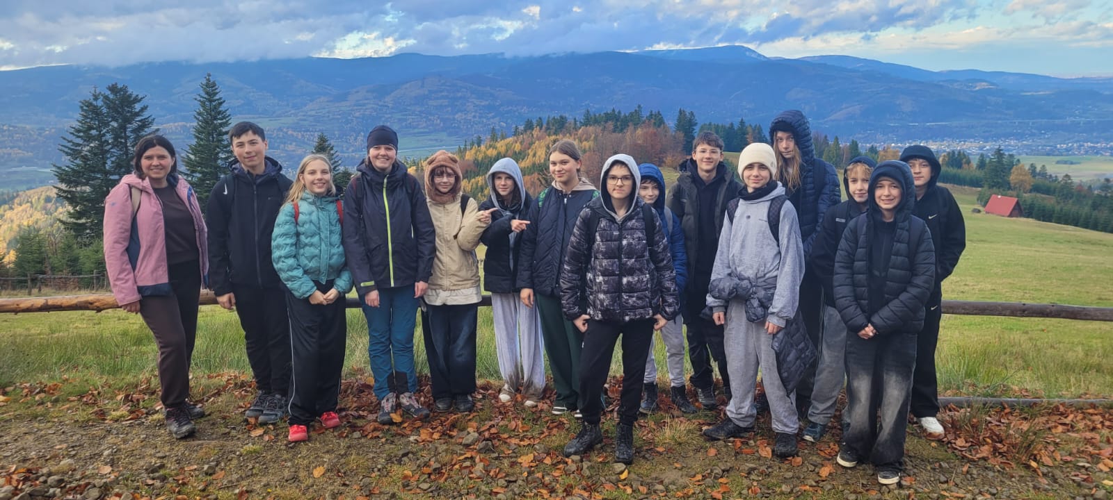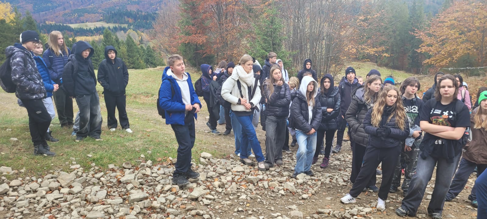 Po lekcji historii przyszła pora na kontakt z naturą – wędrówka szlakiem z Żabnicy na Halę Boraczą, gdzie czekało na wszystkich ognisko z pysznym pieczeniem kiełbasek. W drodze powrotnej uczniowie podziwiali malownicze widoki, schodząc niebieskim szlakiem przez Prusów.