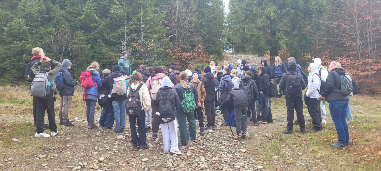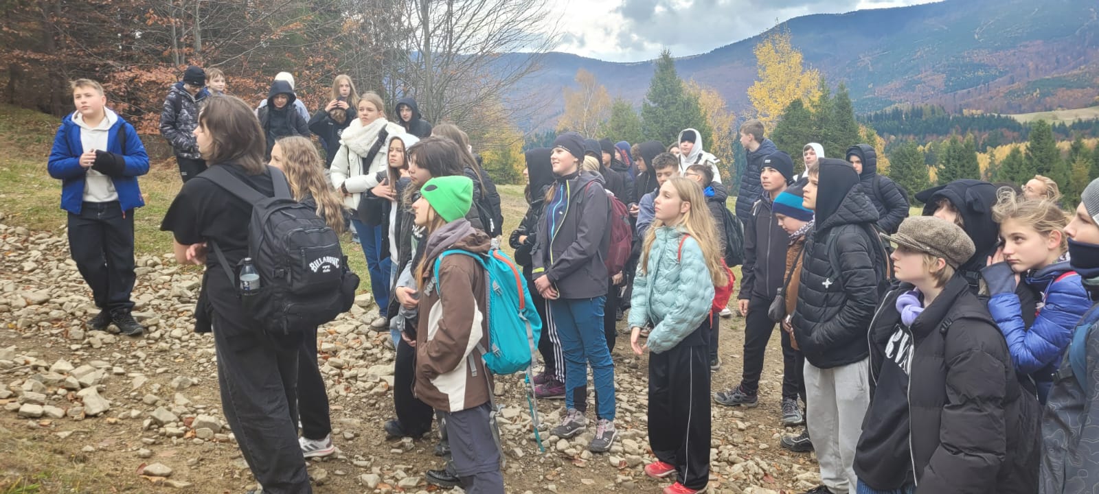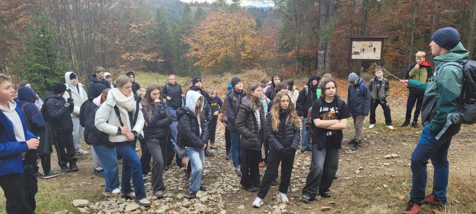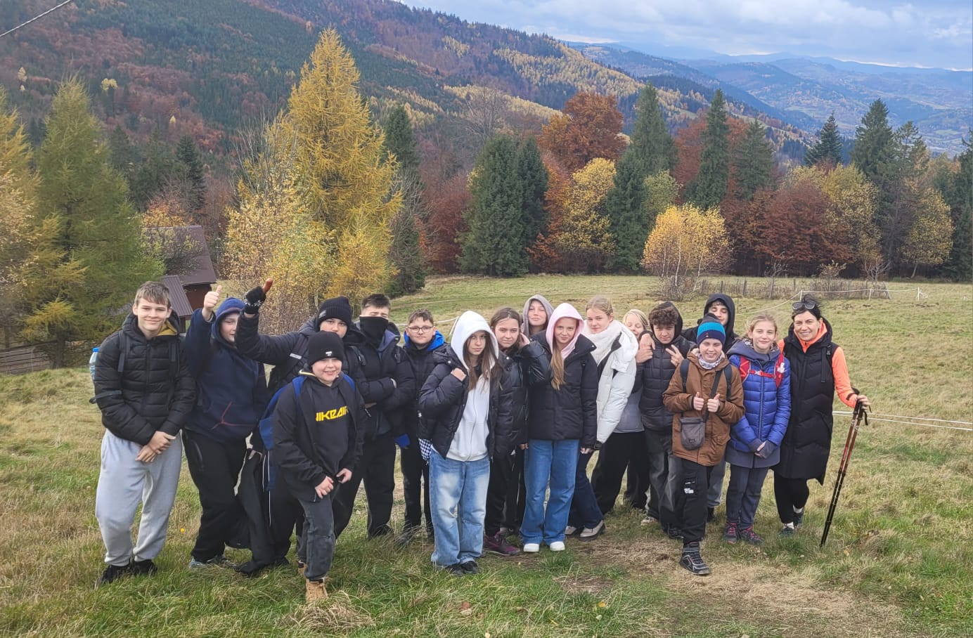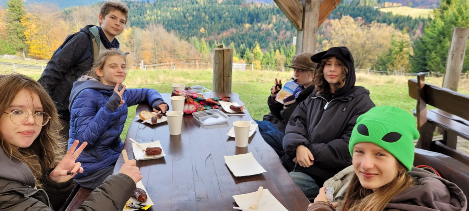 Po lekcji historii przyszła pora na kontakt z naturą – wędrówka szlakiem z Żabnicy na Halę Boraczą, gdzie czekało na wszystkich ognisko z pysznym pieczeniem kiełbasek. W drodze powrotnej uczniowie podziwiali malownicze widoki, schodząc niebieskim szlakiem przez Prusów.