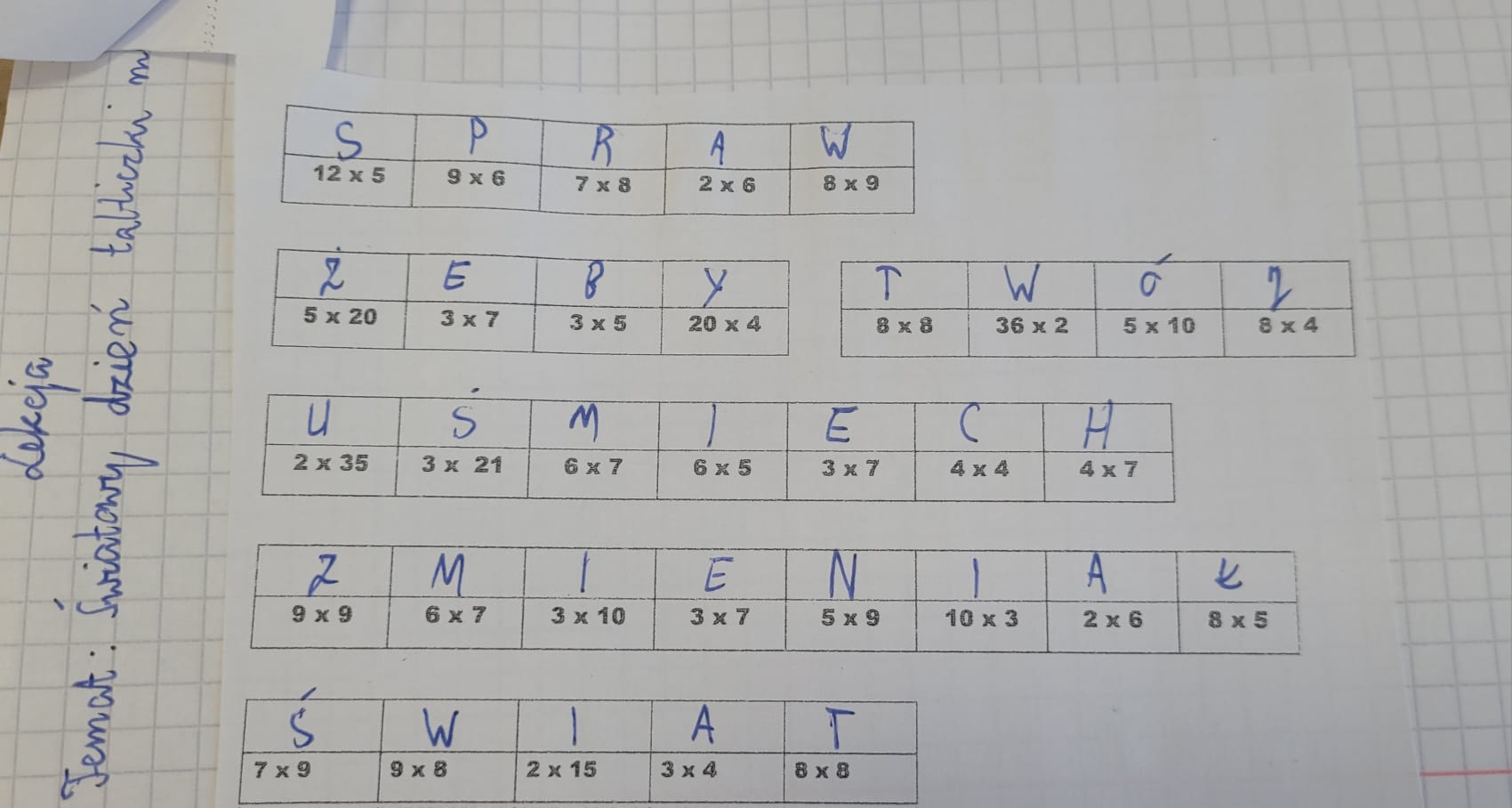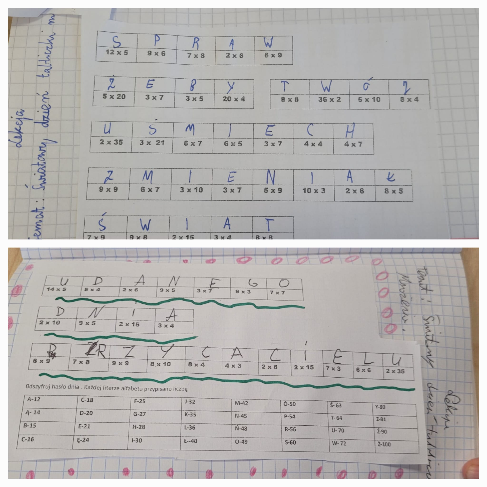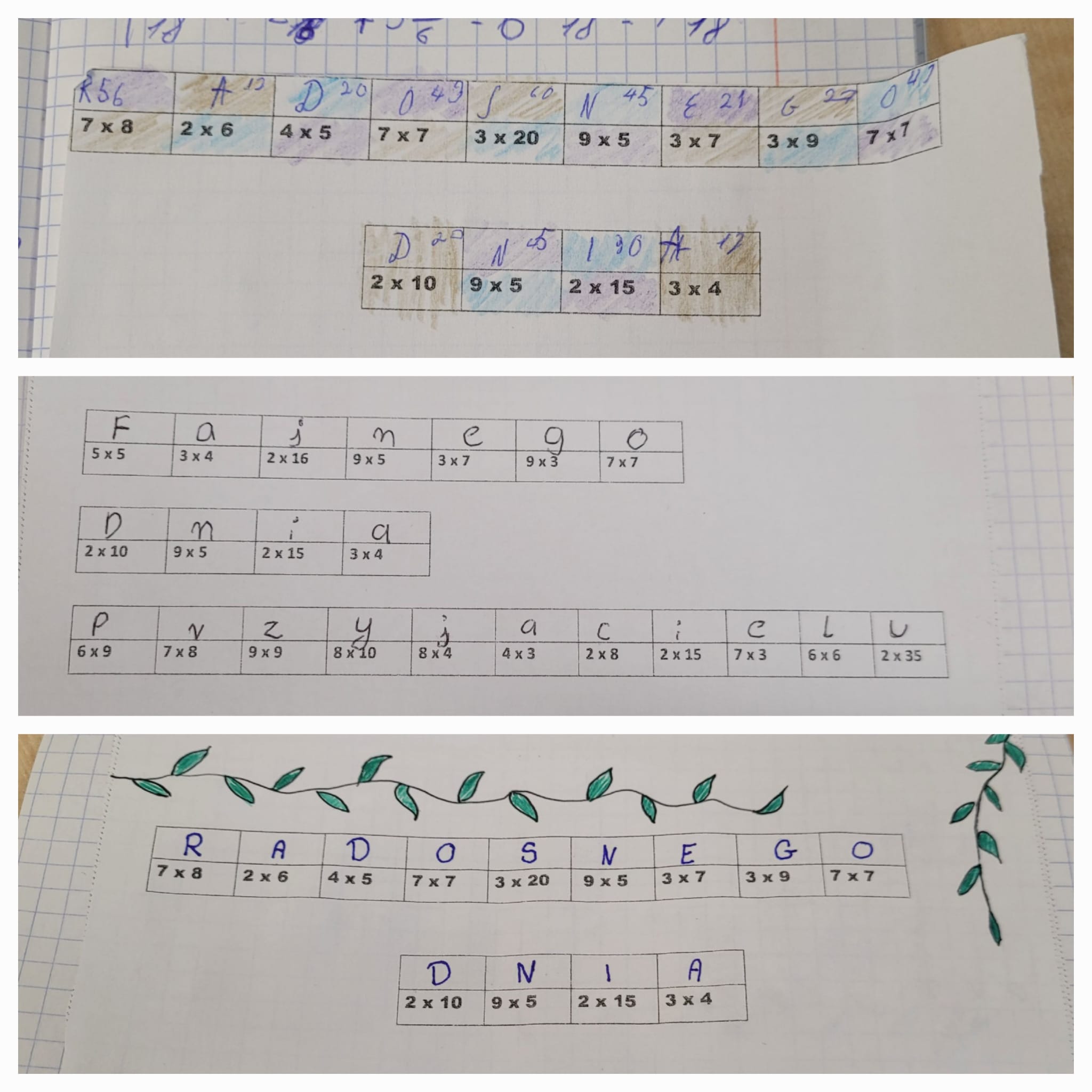 Z tej okazji na lekcjach matematyki klasy 5B, 6B, 7A i 7B wzięły udział w wyjątkowej zabawie: Szyfrowanym Dniu Pozdrowień Tabliczką Mnożenia.
